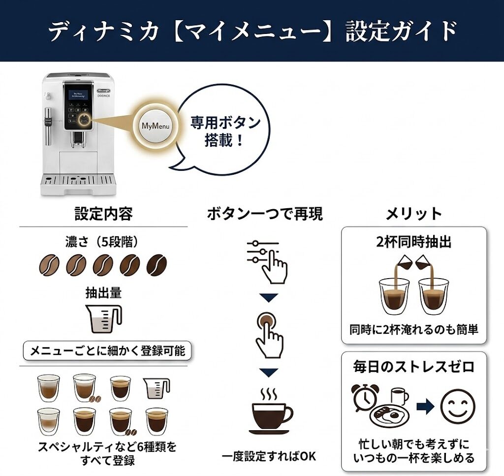 毎朝コーヒーの設定を考えるのが面倒だと感じたりいつも同じ味を失敗せずに飲みたかったりするならマイメニュー機能があるディナミカ一択です。
